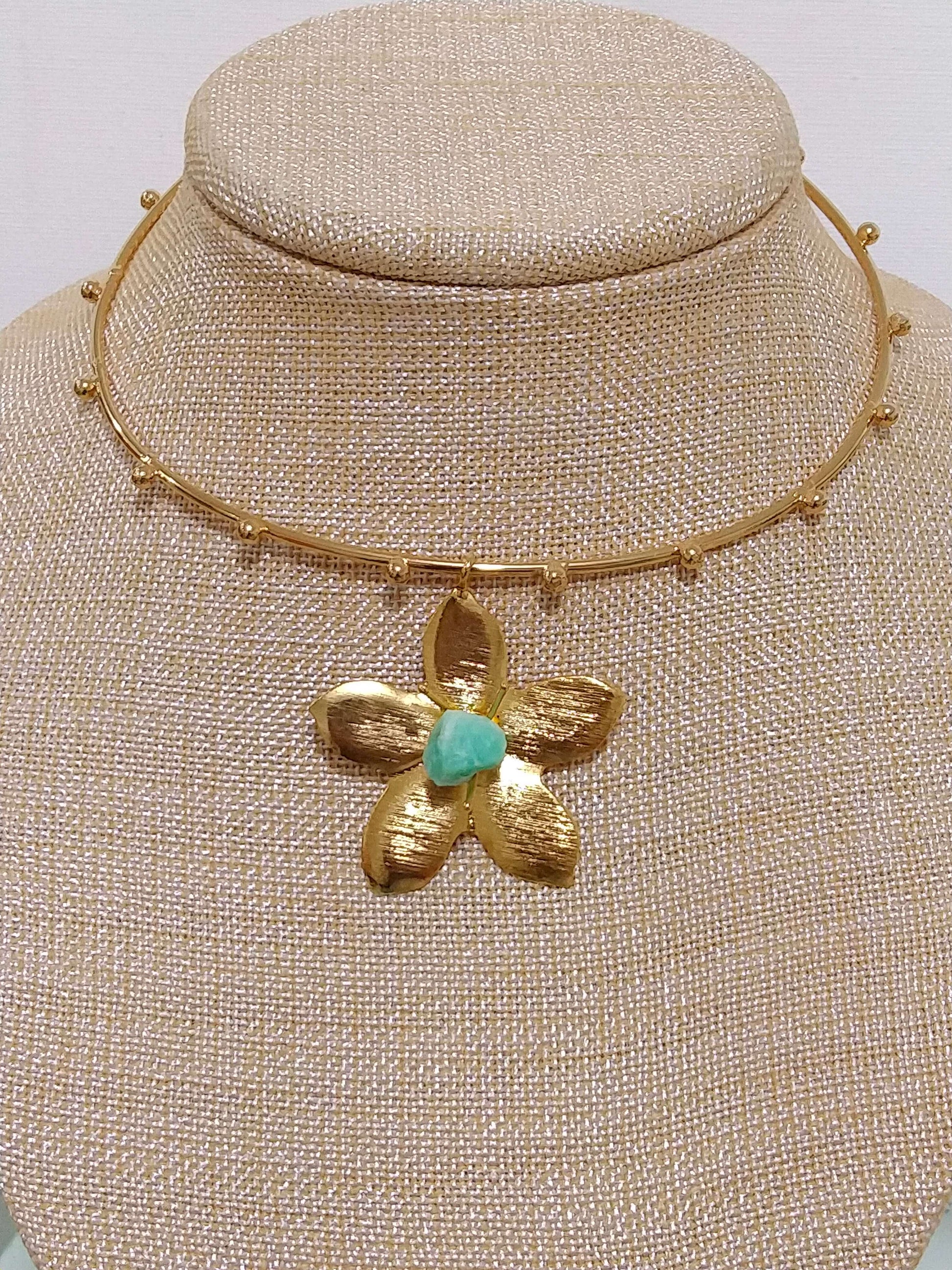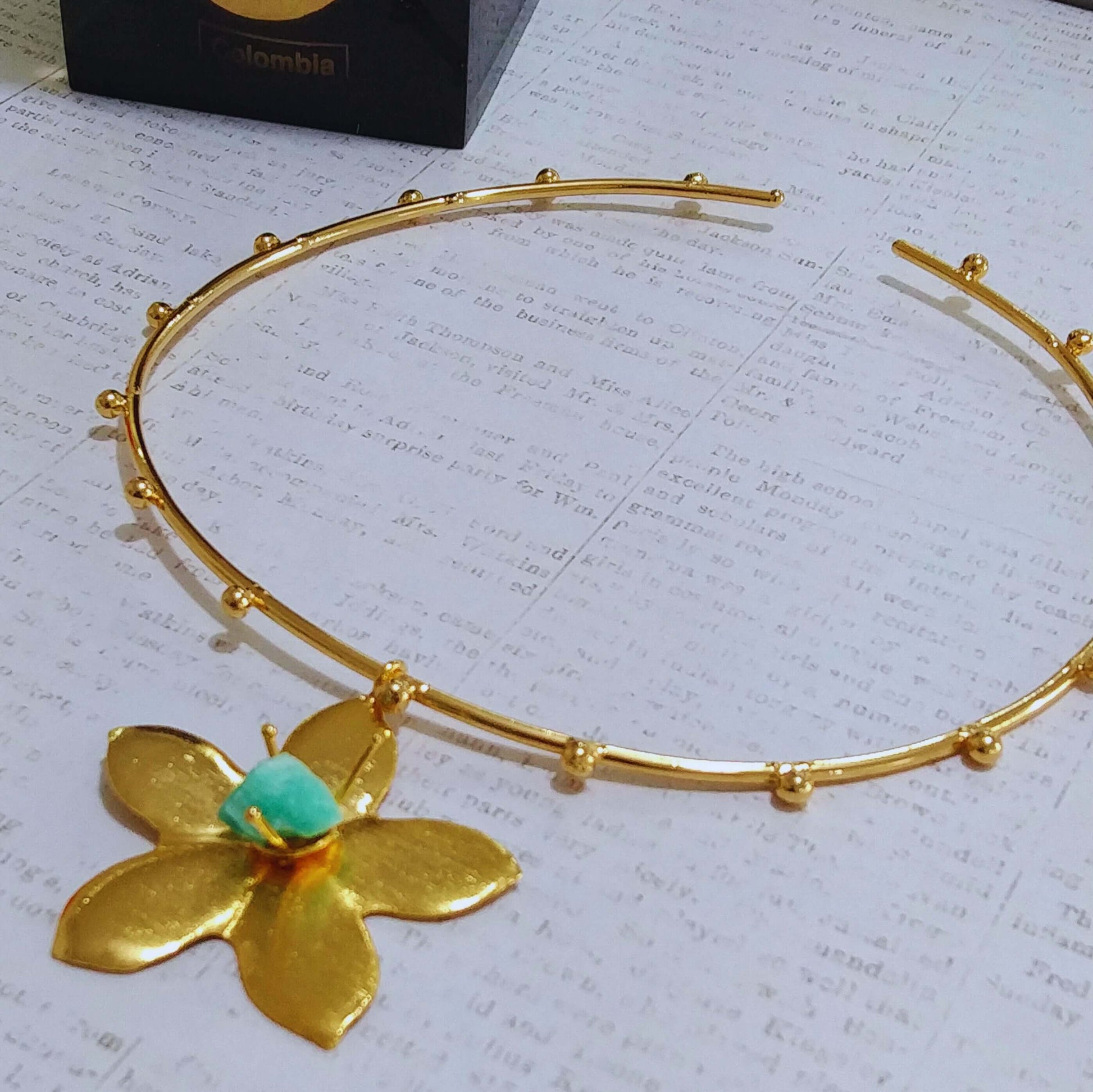Ladies choker with rustic emerald flower pendant in 24K gold plated bronze
