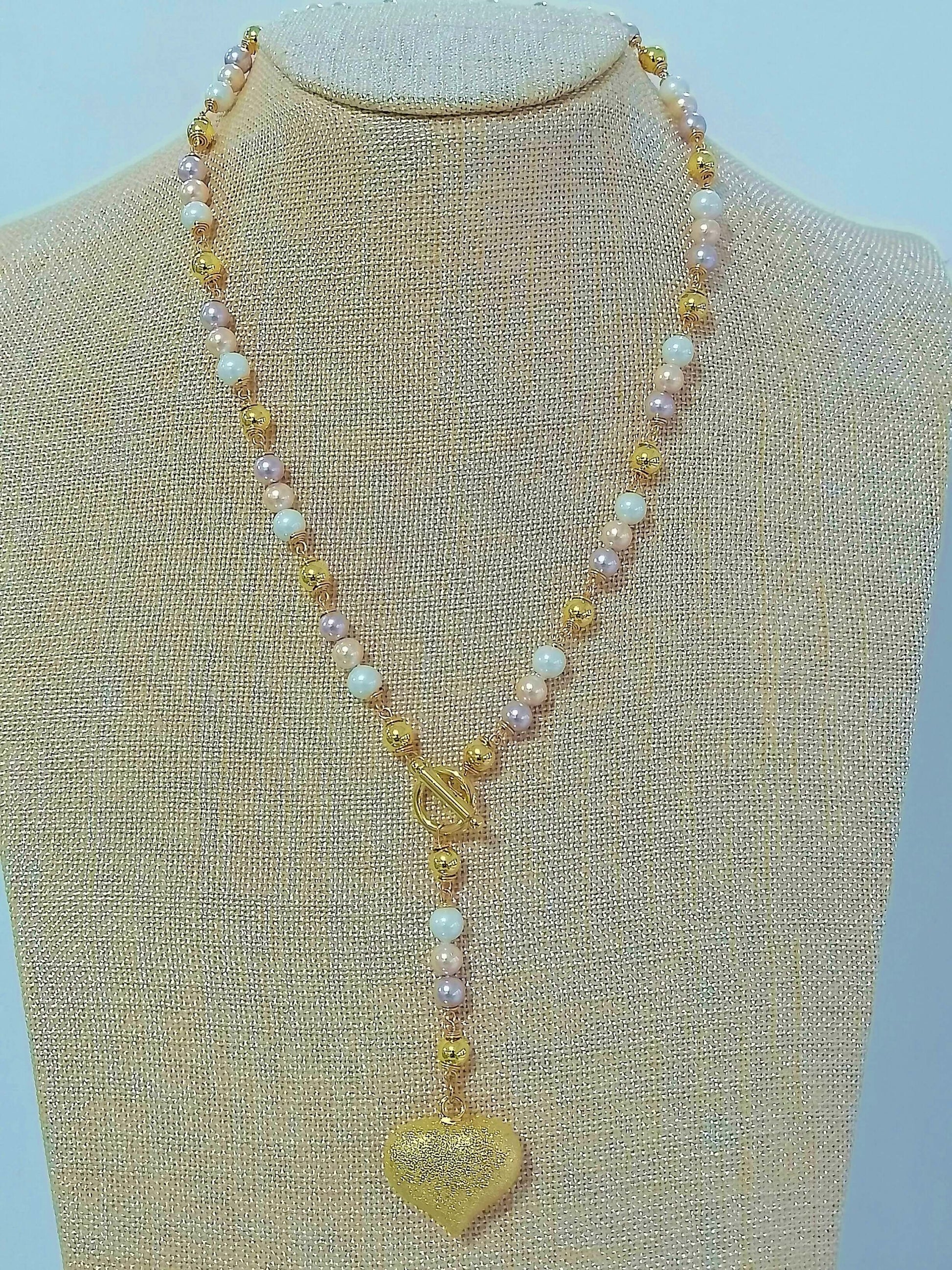 Check out this choker of mother-of-pearl pearls that look like they've come straight from the Caribbean Sea, strung on gold-filled thread, with a frosted rhodium-plated heart-shaped pendant that's sure to captivate at first sight! Available in two versions that will make you sigh: one with pearls in pastel shades of pink, beige, and white—sweet as a raspao! And another in grape, beige, and blue—mysterious as a night on the Malecón!