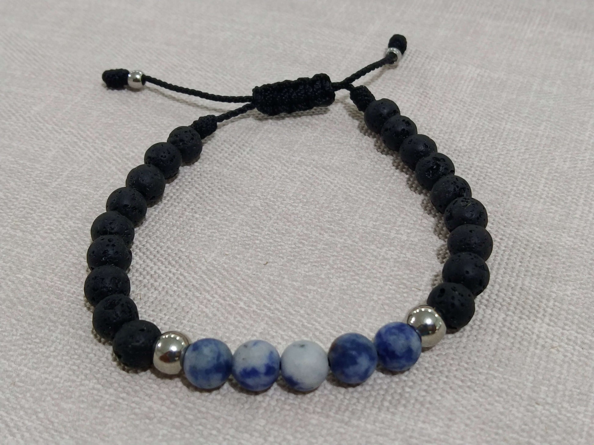 If you want to wear an elegant and casual men's bracelet, you will love this unique piece made with natural stones of sodalite and volcanic lava. Sodalite is a gem that protects against negative energies, promotes meditation and concentration, and helps eliminate the ego. Volcanic lava is a rock that revitalizes the body and mind, offers emotional stability and serenity, and attracts positive vibrations. In addition, this bracelet has steel balls that give it a touch of shine and resistance, and top quality finishes that guarantee its durability. This bracelet is adjustable, so it fits any size wrist. Inspired by the glamor of fashion, this bracelet is a perfect complement to your outfit, which will reflect your style and good taste.