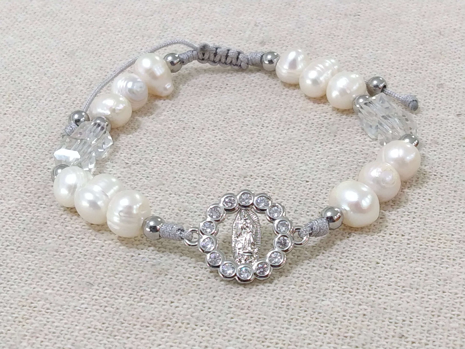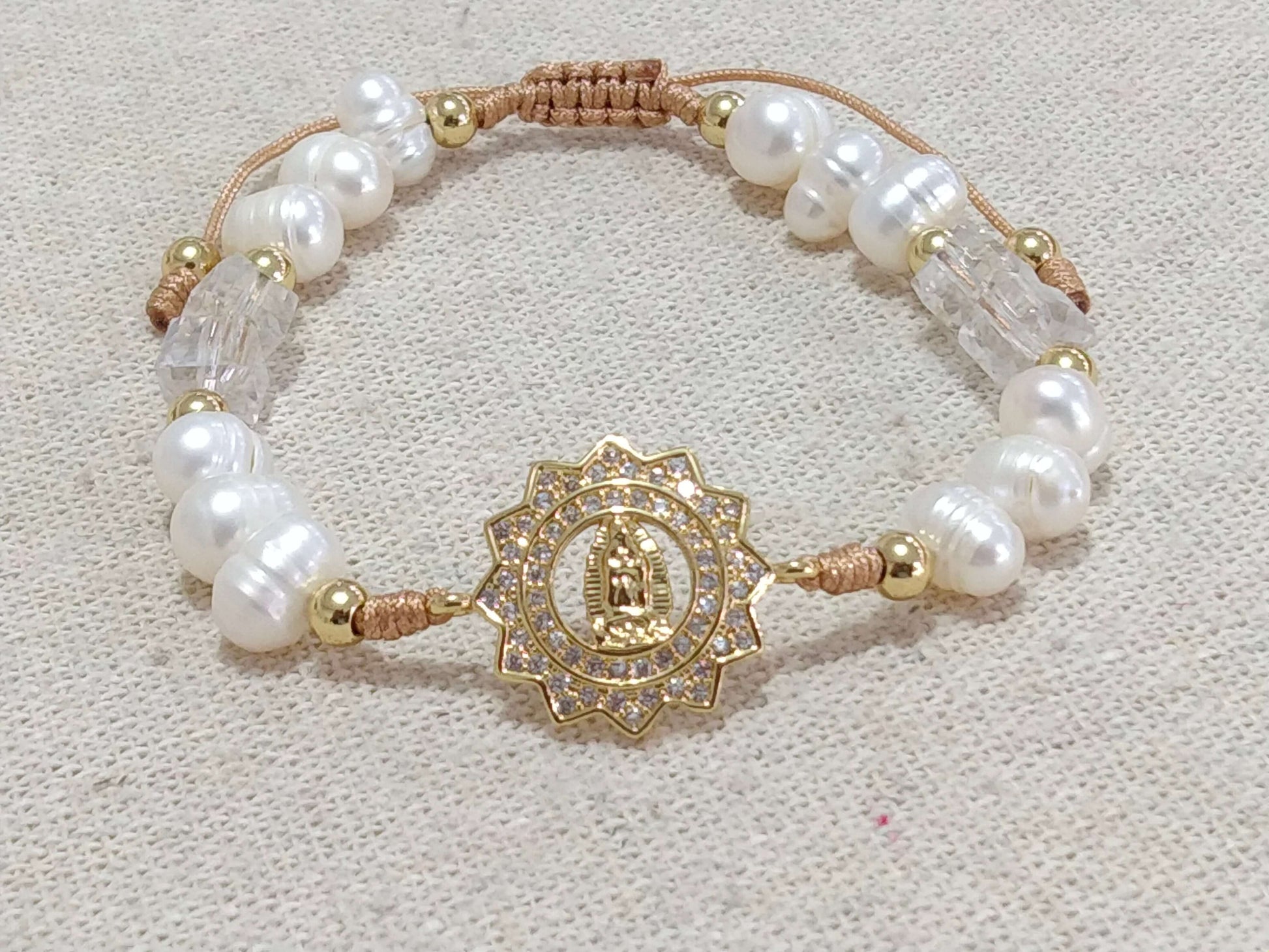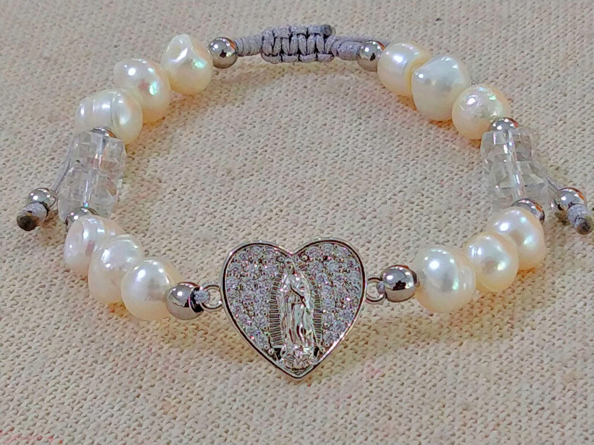 This Virgin of Guadalupe bracelet is a unique and special piece, perfect for any occasion. It is made by hand with high quality threads and natural pearl and crystal beads, which give it incomparable shine and beauty. The rhodium-plated pendant with the image of the Virgin of Guadalupe, framed in a heart, adds a touch of elegance and sophistication.